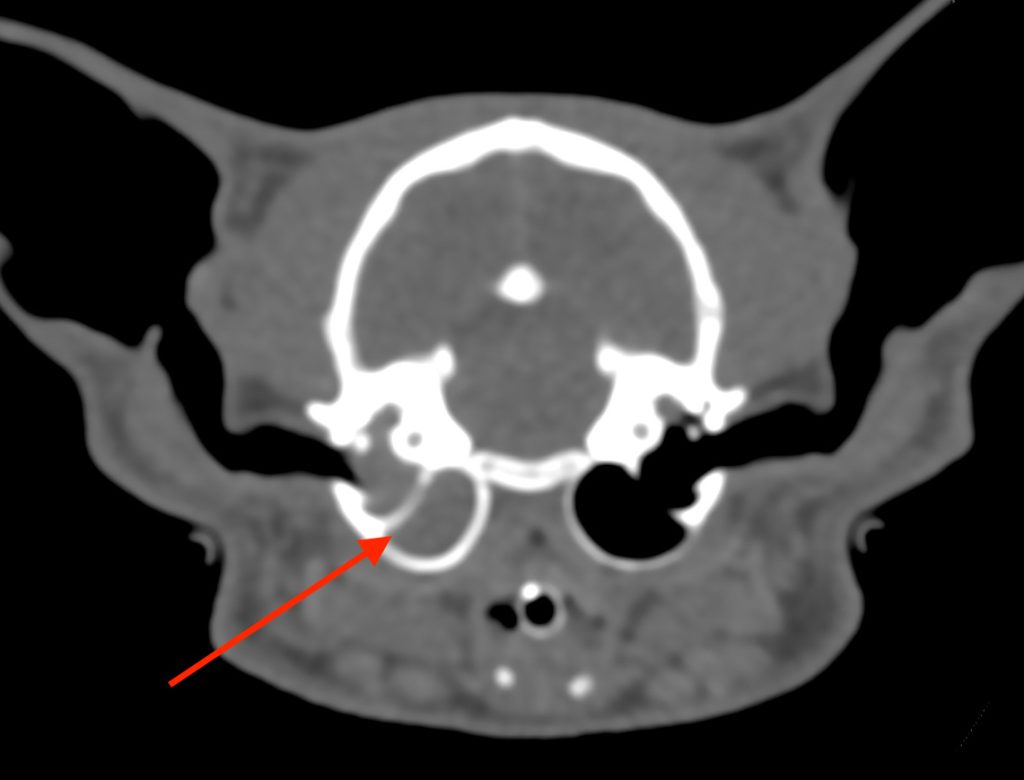 なお、偶然見つかった所見ではありますが、左耳の奥の鼓室胞という空間に、貯留物が認められました。