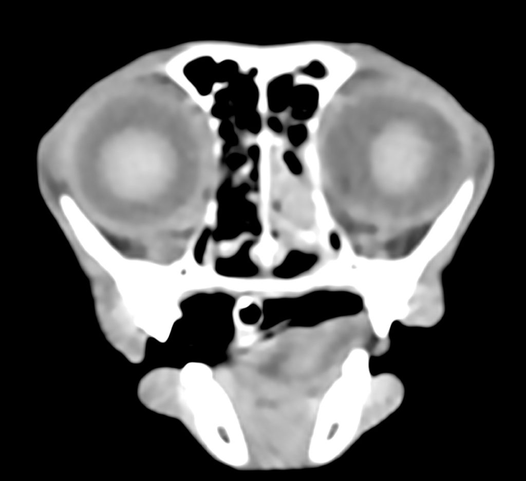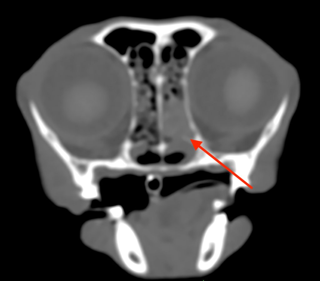 炎症による鼻汁の貯留が疑われました。また、異物や腫瘍を疑う所見は認められず、
