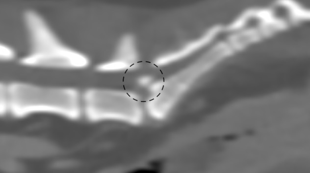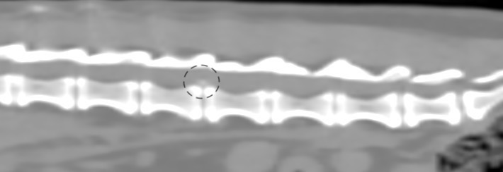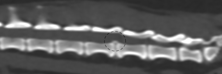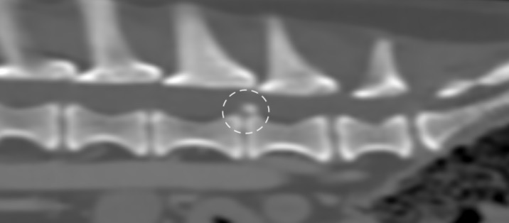 第7腰椎-仙椎間椎間板の脊柱管への突出・石灰化が認められ、中央での脊髄の圧迫所見が認められました。*黒線で囲った部位