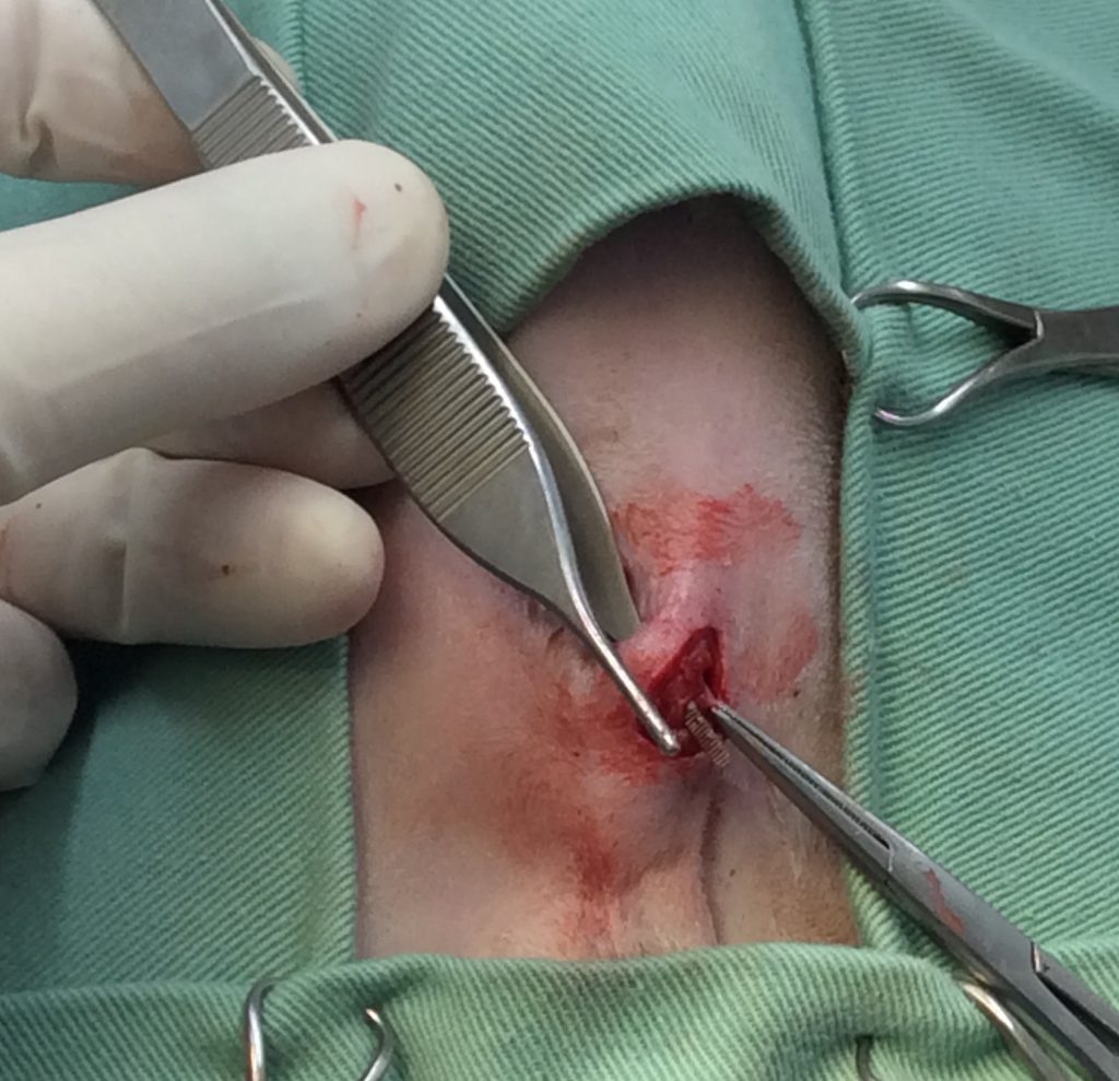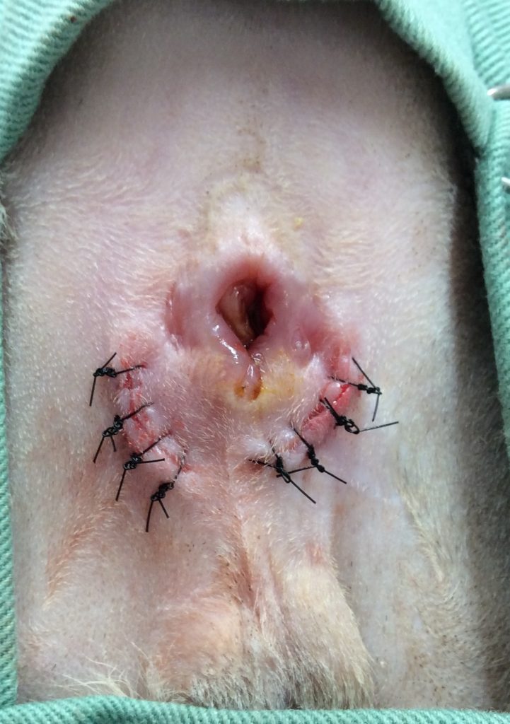 肛門嚢破裂を繰り返していましたので、飼い主様と相談し、肛門嚢切除を行うことの了承を得ました。